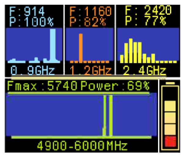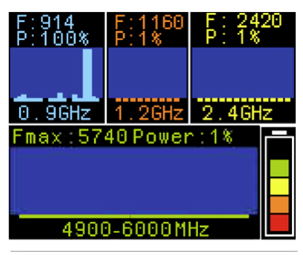 • Example: A detected FPV uplink at 1258 MHz will appear in column 9 of the 1.2 GHz window; power at 84% = 8 consecutive beeps.