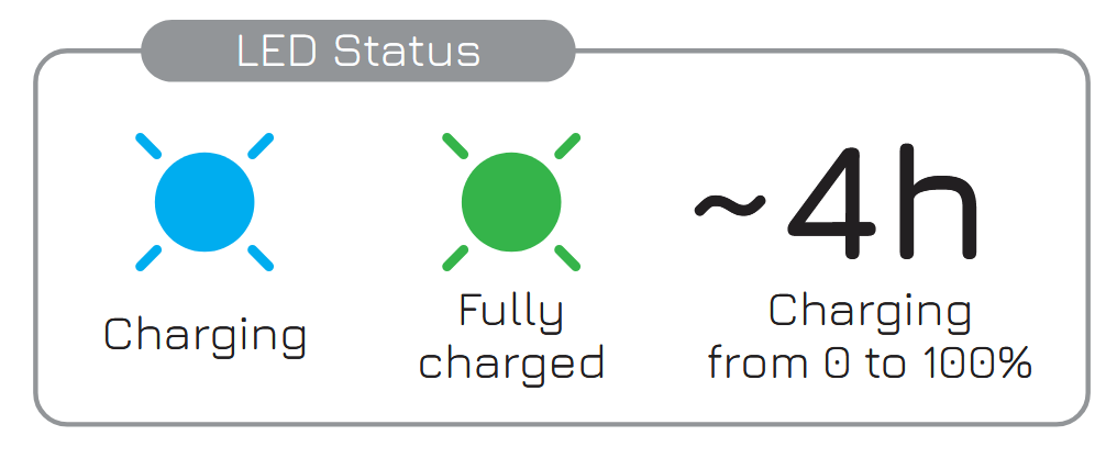 • Battery lasts 6–8 hours and recharges in ~4 hours